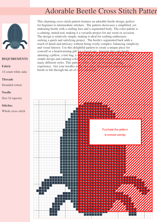 Stitch up some smiles with this charming cross-stitch pattern featuring an adorable beetle! Perfect for beginner to intermediate stitchers, this pattern showcases a simplified yet endearing beetle design with a friendly face and segmented body. The calming, muted teal color palette makes it a versatile project for any room or occasion. The beetle’s segmented back adds a touch of detail and intricacy without being overly complex, offering a satisfying crafting experience. Its simple design makes it ideal for a quick project, perfect for crafting enthusiasts seeking a relaxing and rewarding activity. Use this delightful pattern to create a unique piece for yourself or a heartwarming gift for a loved one. Imagine this cute beetle adorning a pillow, tote bag, wall hanging, or even a child’s clothing! The simple design and soothing teal color scheme allow for a versatile final product to match many different styles. This digital download includes a clear, easy-to-follow pattern chart and instructions, ensuring a smooth and enjoyable stitching process. Get your needles ready and enjoy bringing this endearing little beetle to life!