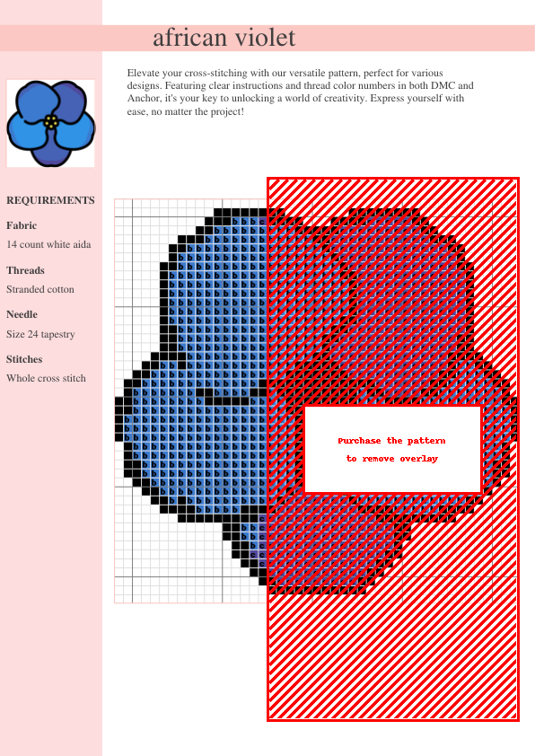 Capture the vibrant beauty of nature with our exquisite African Violet cross stitch pattern! This charming design showcases the delicate petals and rich colors of an African violet, making it a rewarding project for intermediate to advanced cross-stitchers. The detailed rendering and easy-to-follow instructions ensure a seamless stitching experience. This downloadable PDF (two pages) includes a color-coded symbol chart and a comprehensive thread list compatible with both DMC and Anchor threads. Imagine this stunning cross-stitch adorning your walls, adding a touch of elegant nature to your home, or presented as a thoughtful, handmade gift. Perfect for crafters looking for a detailed and beautiful project to enhance their cross-stitch skills. Let your creativity bloom!