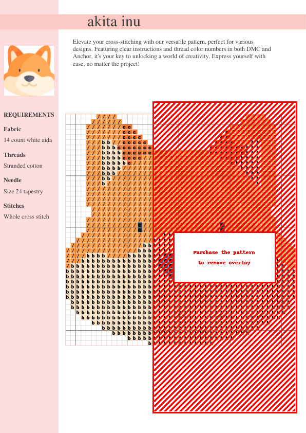 Stitch up heartwarming canine charm with our delightful Akita Inu cross-stitch pattern! This detailed design showcases an expressive Akita pup, perfect for adding a touch of personality to your home décor or gifting to a fellow dog lover. The pattern provides clear, easy-to-follow instructions and a comprehensive color key using both DMC and Anchor stranded cotton thread numbers for a seamless stitching experience. This downloadable, two-page PDF pattern includes a symbolic chart, a complete thread list, and showcases intricate details, from the pup’s soft fur to its expressive eyes. It’s a rewarding project for cross-stitchers of all skill levels, from beginners seeking a charming first project to seasoned stitchers looking for a delightful challenge. The pattern’s versatile color palette allows for creative customization to match your existing color schemes. Unleash your creativity and bring this sweet Akita to life! Perfect for pillows, wall hangings, or a unique and personalized pet portrait. Download your pattern instantly and start stitching your way to canine cuteness!