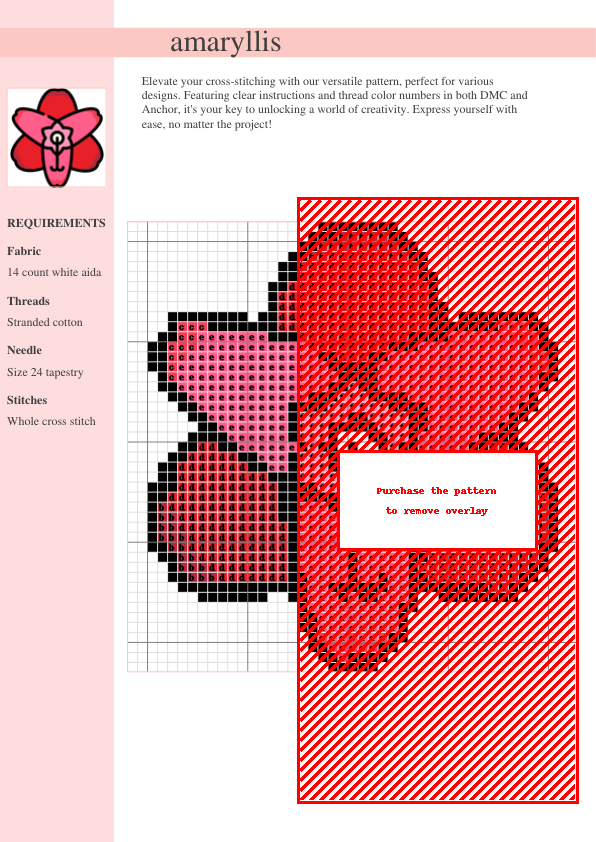 Unleash your inner artist with our captivating Amaryllis Bloom cross-stitch pattern! This vibrant and meticulously detailed floral design showcases a stunning amaryllis flower, perfect for cross-stitch enthusiasts of all skill levels. The pattern offers clear, easy-to-follow instructions and includes convenient thread color codes in both DMC and Anchor formats for a seamless stitching experience. Create a breathtaking piece of art to frame and proudly display in your home or gift to a loved one. The rich color palette creates a captivating contrast, beautifully highlighting your needlepoint skills. This downloadable PDF pattern includes a symbol key and a detailed pattern chart across two pages for easy navigation. Download instantly and begin stitching your amaryllis masterpiece! Ideal for experienced crafters and beginners alike, this pattern provides a relaxing and rewarding crafting experience. Perfect for adding a touch of elegance to any home, office, or as a thoughtful personalized gift. Embrace the joy of floral embroidery and needlepoint! Experience the beauty and serenity of creating a handmade treasure.