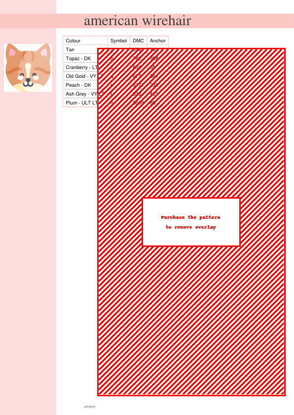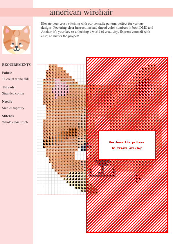 Stitch up some feline fun with this charming American Wirehair cross-stitch pattern! This meticulously crafted design beautifully captures the unique texture and personality of this beloved breed. The pattern provides clear, easy-to-follow instructions and a comprehensive color chart using both DMC and Anchor stranded cotton thread numbers, making it accessible to cross-stitch enthusiasts of all skill levels. Intermediate stitchers will especially appreciate the intricate detail in the fur and facial features! This two-page PDF download features a user-friendly symbol chart for effortless stitching and a complete list of required thread colors. The pattern’s color palette is both charming and realistic, making the finished piece a delightful addition to your home, a thoughtful gift for a cat lover, or a unique piece for your cross-stitch collection. Download your pattern instantly and begin your next crafting adventure today! Perfect for adding a touch of whimsical charm to any project, home decor, or handmade gift. This design offers a delightful blend of detail and stitch-ability, making it a rewarding project for intermediate crafters looking for a challenging and satisfying project. Finished size is adjustable; customize your fabric for your perfect piece!