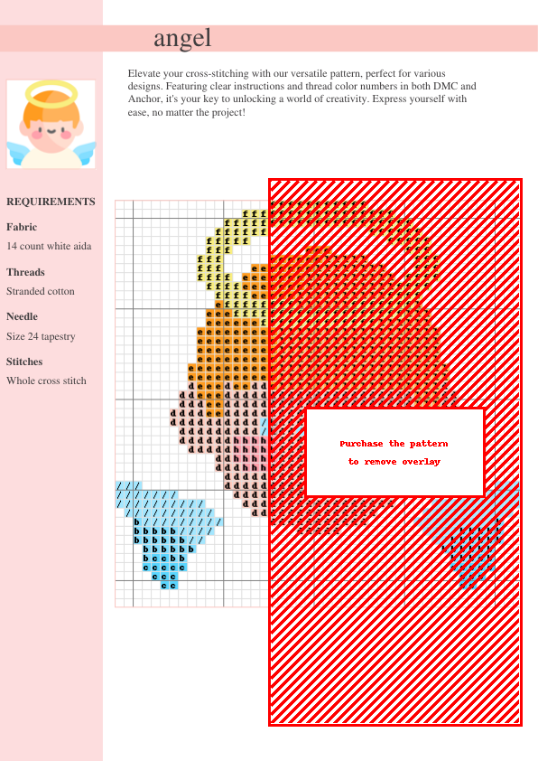 Downloadable PDF cross stitch pattern of a charming angel. Features DMC and Anchor thread charts for easy color selection. Clear instructions suitable for all skill levels. Create beautiful wall art, unique gifts, or home décor accents. Instant download! Perfect for beginners and experienced stitchers alike.