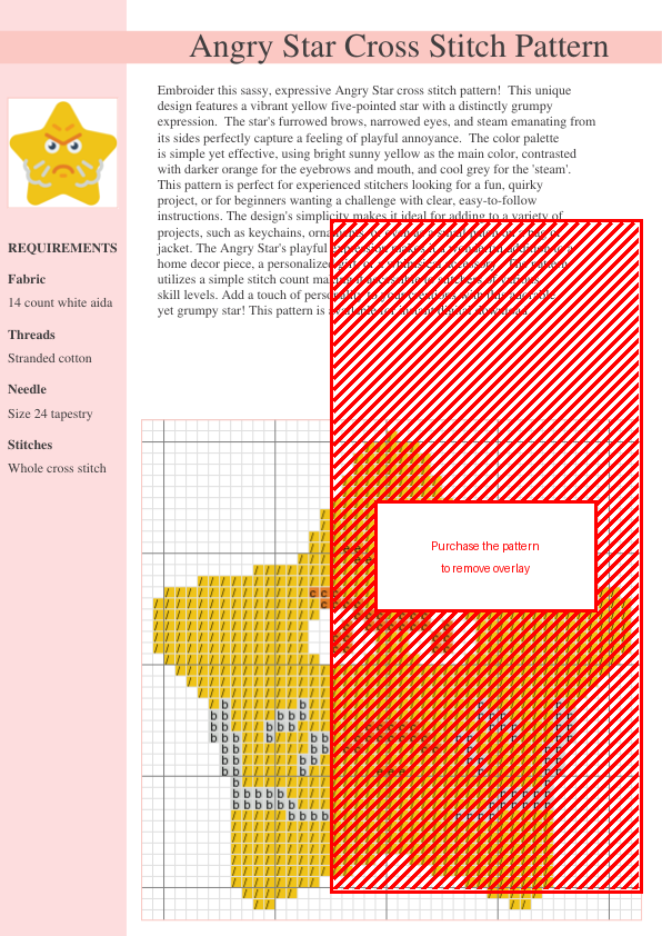 Embroider this sassy, expressive Angry Star! This unique cross stitch pattern features a vibrant yellow five-pointed star with a distinctly grumpy expression – furrowed brows, narrowed eyes, and escaping steam perfectly capture playful annoyance. The color palette is simple yet effective, using bright sunny yellow, contrasted with darker orange and cool grey. This pattern is perfect for experienced stitchers seeking a fun, quirky project, or for beginners wanting a manageable challenge with clear instructions. Its simplicity makes it ideal for keychains, ornaments, patches, or home decor. The Angry Star’s playful expression makes it a wonderful personalized gift or accessory. A simple stitch count makes it accessible to all skill levels. This digital pattern is an instant download – start stitching today! #crossstitch #crossstitchpattern #embroidery #embroiderypattern #crafts #craftideas #DIY #instantdownload #digitaldownload #angrystar #yellowstar #quirky #fun #beginnerfriendly #personalizedgift