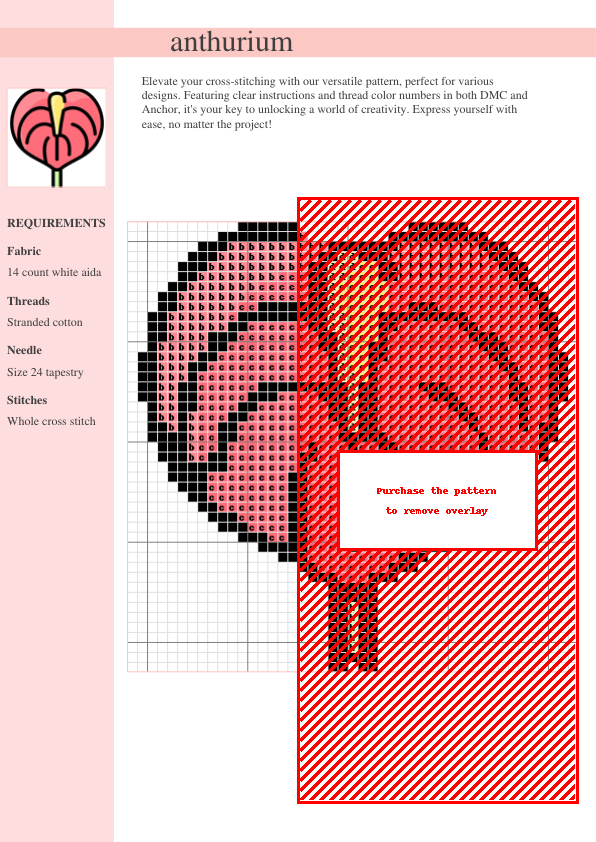 Unleash your inner artist with our exquisite Anthurium cross stitch pattern! This detailed design beautifully captures the vibrant hues and exotic elegance of a tropical Anthurium flower. Perfect for adding a touch of paradise to your home decor, crafting a unique handmade gift, or simply enjoying a relaxing stitching session. The pattern provides clear, easy-to-follow instructions and a comprehensive thread list using both DMC and Anchor thread numbers for a smooth stitching experience. This two-page PDF instant download includes a symbol chart and corresponding color codes, making it easy to follow. Ideal for intermediate cross-stitchers seeking a challenging yet rewarding project, the intricate details of the flower and leaves offer a satisfying stitching experience. Imagine the finished piece framed and displayed, adorning a pillow, or incorporated into a larger needlepoint project. Bring the lush beauty of the tropics into your life with this high-quality, printable cross stitch pattern. Download now and start stitching your own vibrant masterpiece!