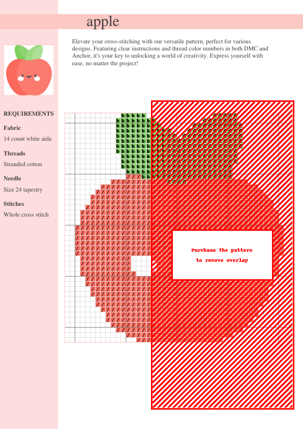 Create a juicy apple cross-stitch masterpiece with this easy-to-follow pattern! Includes DMC and Anchor thread color codes, an instant PDF download, and clear instructions for a delightful crafting experience. Perfect for beginners and experienced stitchers. Stitch a sweet and charming decoration or gift!