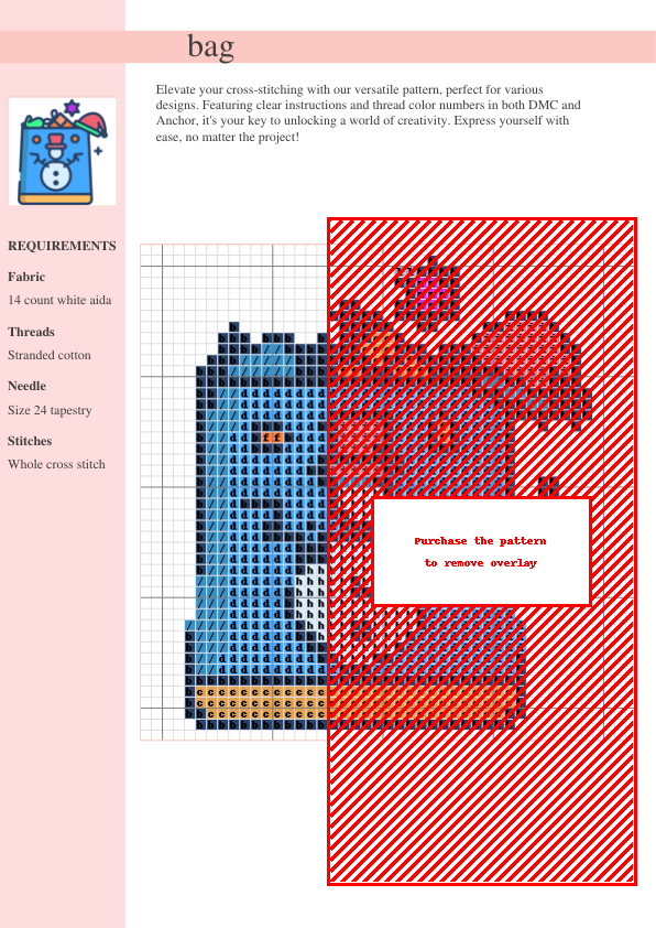 Unleash your creativity with our enchanting cross-stitch floral tote bag pattern! This delightful design features a vibrant bouquet of blossoms and leaves, perfect for adding a touch of handmade charm to your everyday life. The pattern provides clear, step-by-step instructions and a comprehensive color chart using both DMC and Anchor thread numbers for easy material sourcing. Imagine the satisfaction of crafting your own unique, stylish tote bag – a perfect gift or a treasured addition to your personal collection. This downloadable PDF pattern includes a detailed two-page pattern with a symbol chart and a complete list of DMC and Anchor thread numbers, ensuring a smooth and enjoyable crafting experience. Suitable for intermediate crafters, yet approachable for enthusiastic beginners, this pattern promises a rewarding crafting journey. Let your stitches bloom and bring a touch of handmade elegance to your wardrobe! Download your pattern instantly and start stitching today!