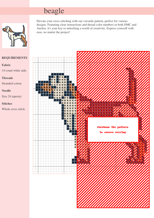 Downloadable PDF cross-stitch pattern of an adorable Beagle. Includes DMC and Anchor thread color charts for easy conversion. Easy-to-follow instructions perfect for beginner to intermediate stitchers. Create a charming piece of needlepoint art or a thoughtful, handmade gift! Enjoy a rewarding crafting experience with this medium-difficulty pattern.