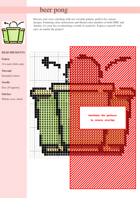 Unleash your inner artist with this witty Beer Pong cross-stitch pattern! This fun and quirky design is perfect for adding a playful touch to your home décor or creating a truly unique and memorable gift. The pattern meticulously depicts a classic beer pong game in action, capturing the energetic and lighthearted spirit of the moment. You’ll receive clear, easy-to-follow instructions and a comprehensive color chart featuring both DMC and Anchor thread brands for seamless stitching. This downloadable, two-page PDF pattern provides both a charted design and a complete thread list, ensuring a smooth and enjoyable crafting experience. Ideal for intermediate cross-stitchers, this pattern offers a rewarding project that’s both fun and satisfying to complete. Download your pattern instantly and get stitching! This isn’t just a craft; it’s a conversation starter! The finished piece makes a great gift for birthdays, housewarmings, or any occasion for the beer pong enthusiast in your life. Add a touch of humor and personality to your home with this unique cross-stitch project. Includes color key for both DMC and Anchor threads. Perfect for intermediate skill level.