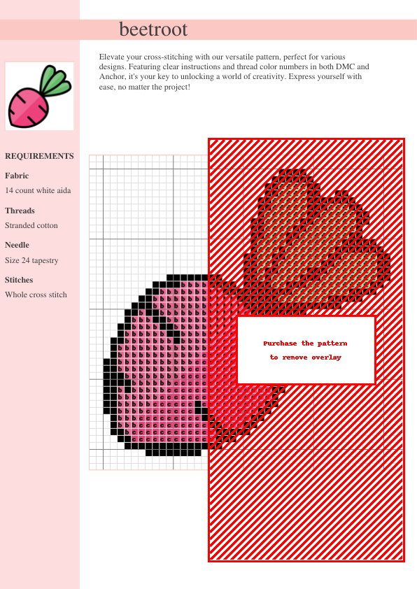 Unleash your creativity with our captivating Beetroot Cross Stitch Pattern! This downloadable PDF pattern brings the rich jewel tones of beetroot to life, creating a sophisticated and earthy design perfect for home décor, cushions, or a unique handmade gift. The pattern boasts clear, easy-to-follow instructions and a comprehensive color key using both DMC and Anchor thread numbers for a seamless stitching experience, regardless of your skill level. Featuring a detailed symbol chart, a complete thread list for both DMC and Anchor brands, and presented across two convenient PDF pages, this pattern guarantees an enjoyable crafting journey. Download instantly and begin stitching this beautiful design that masterfully blends modern and traditional cross-stitch styles, adding a touch of earthy elegance to any project. Perfect for cross stitch enthusiasts, beginners, and anyone looking for a rewarding crafting experience.
