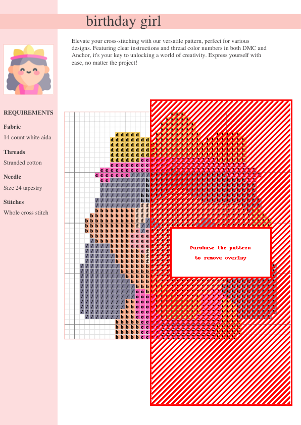 Celebrate birthdays with this adorable cross stitch pattern! This versatile design is perfect for adding a personal touch to cards, wall art, or even a special birthday gift. The charming birthday girl features a delightful expression, surrounded by pastel-colored balloons and a whimsical cake. This heartwarming design uses a soft and whimsical color palette of pastel pinks, blues, and yellows, creating a sweet and memorable keepsake. Our easy-to-follow instructions include both DMC and Anchor thread color numbers for a smooth stitching experience. The PDF download contains a two-page document with a clear symbol chart and a complete thread list. Perfect for beginner to intermediate cross-stitchers, this pattern is a delightful way to express your creativity. Download instantly and start stitching your birthday wishes! Create beautiful handmade birthday cards, charming wall art, or unique birthday gifts. The finished project makes a wonderful birthday present or a sweet addition to your own crafting collection. This pattern is ideal for adding a personal, handmade touch to your celebrations. Stitch your love and make it a birthday to remember!