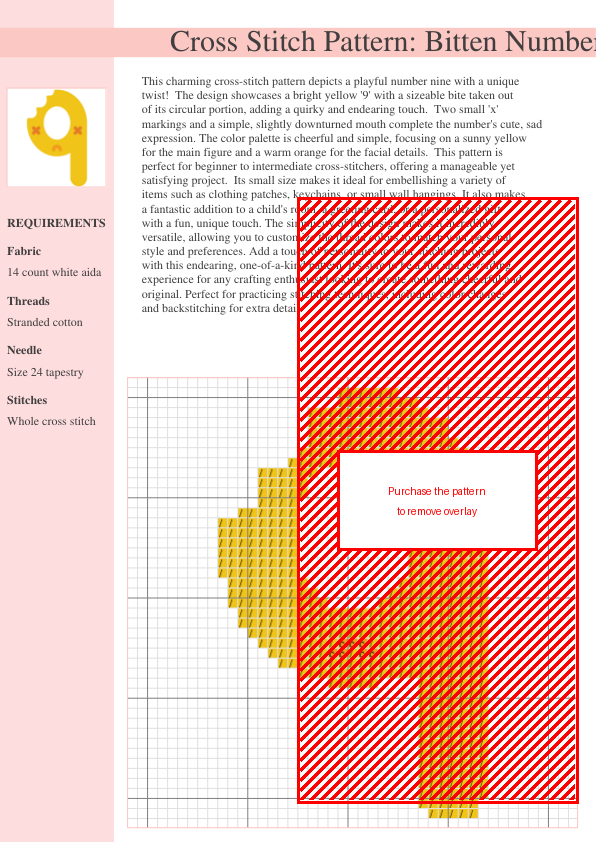 Stitch up some smiles with this adorable cross-stitch pattern! This charming design features a bright yellow number nine with a playful bite taken out of it, giving it a quirky and endearingly sad expression. Two tiny ‘x’ marks and a simple, downturned mouth complete its cute face. The color palette is cheerful and simple, primarily using sunny yellow and a warm orange for the facial details. This pattern is perfect for beginner to intermediate cross-stitchers, offering a manageable yet rewarding project. Its compact size makes it ideal for adding a unique touch to various crafts, including clothing patches, keychains, small wall hangings, greeting cards, or even personalized gifts. Imagine this fun design brightening up a child’s room or adding a touch of whimsy to a handmade item! The pattern’s simplicity allows for easy customization; feel free to experiment with different thread colors to match your personal style. Practice your cross-stitch techniques, including color changes and backstitching (for extra detail!), while creating something cheerful and original. This delightful pattern is sure to bring joy to both the crafting process and the finished product. Download your instant PDF pattern now and start stitching! Includes easy-to-follow instructions and a color key.