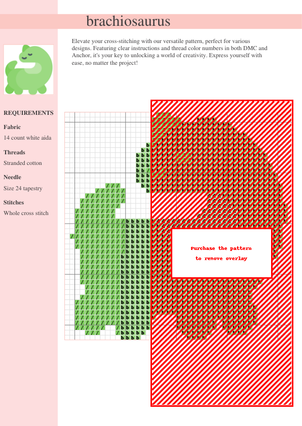 Stitch a majestic Brachiosaurus with this easy-to-follow cross-stitch pattern! Includes DMC & Anchor floss color codes, perfect for all skill levels. Instant download! Create stunning wall art, unique gifts, or add a fun dinosaur touch to any project. A perfect blend of prehistoric charm and needlework artistry!