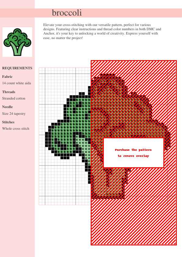 Downloadable PDF cross stitch pattern of an adorable broccoli. Includes DMC and Anchor thread color codes, a clear, easy-to-follow symbol chart, and is perfect for beginners and experienced stitchers! Create unique home décor, gifts, or patches. Fun, whimsical, and a perfect project for adding a touch of personality to your creations!