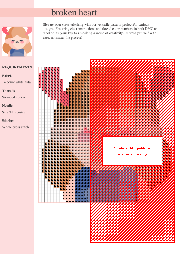 Unleash your creativity with our ‘Mend a Broken Heart’ cross-stitch pattern! This captivating design features a beautifully rendered broken heart meticulously mended, symbolizing healing and resilience. The intricate details and symbolic imagery make this pattern a truly unique and emotionally resonant project. Perfect for expressing feelings through crafting, it’s ideal for creating a personal keepsake, a meaningful gift, or incorporating into a larger mixed media piece. The pattern uses a blend of delicate and bold stitches, offering a satisfying stitching experience for crafters of all skill levels. This easy-to-follow, two-page PDF pattern includes a detailed color symbol chart, a complete thread list with both DMC and Anchor thread numbers and color codes (e.g., DMC 310, Anchor 117), and clear, concise instructions. Download instantly and begin stitching your heartfelt masterpiece! Suitable for beginners and experienced cross-stitchers. Add a touch of handmade love to your creations! This pattern is perfect for those seeking mindful crafting and self-expression through stitching. Download your pattern today and experience the joy of creating something truly special.