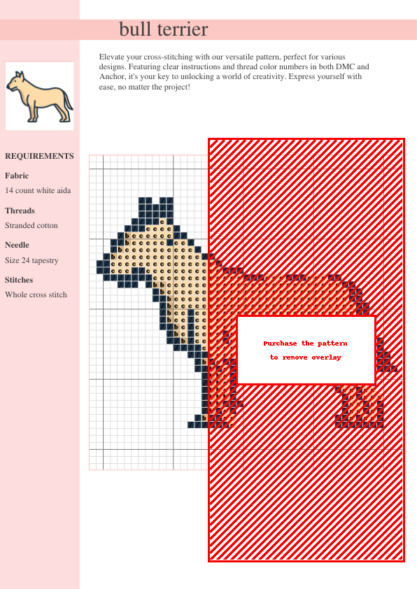 Stitch up some canine charm with this delightful Bull Terrier cross-stitch pattern! This easy-to-follow design is perfect for cross-stitchers of all skill levels, from beginners to experienced crafters. The pattern provides a clear, two-page PDF featuring a detailed symbol chart and a comprehensive thread list utilizing both DMC and Anchor thread numbers for ultimate convenience. This charming pattern showcases a playful Bull Terrier, capturing its unique personality with expressive eyes and a slightly mischievous tilt to its head. The vibrant yet calming color palette makes it a joy to stitch. Imagine your finished piece adorning a cozy pillow, a vibrant wall hanging, a charming tote bag, or even adding a unique touch to a piece of clothing. This is a wonderful project for gifting to fellow dog lovers or enriching your personal handmade collection. Download your instant PDF pattern and begin stitching your adorable Bull Terrier today! Perfect for intermediate or beginner cross-stitch enthusiasts. This pattern offers a delightful blend of simple stitching and intricate details, making it a rewarding project for crafters of all abilities.