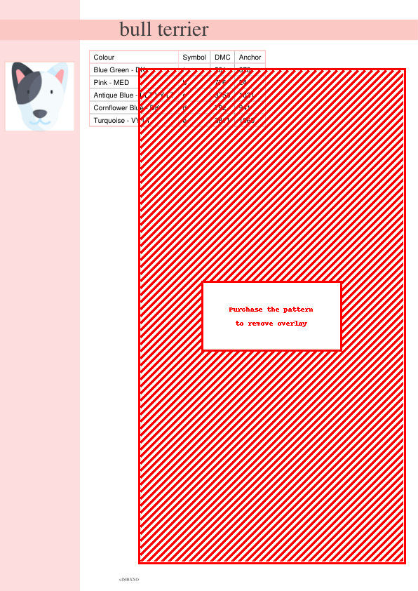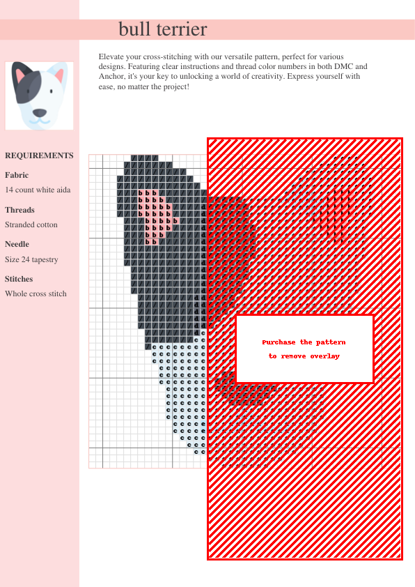 Downloadable cross-stitch pattern of an adorable Bull Terrier. Includes detailed instructions and color charts with DMC and Anchor thread codes. Perfect for beginner to intermediate stitchers. Create a charming piece of home décor or a personalized gift!