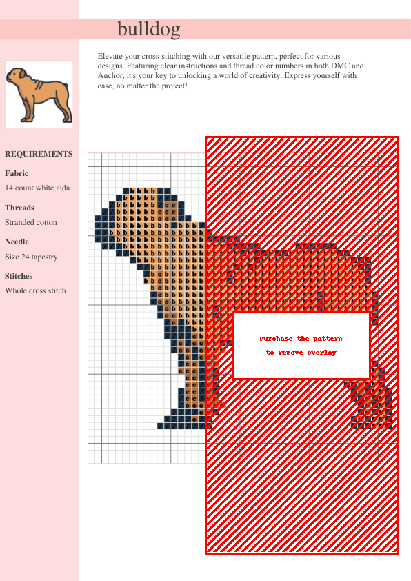 Stitch up some serious cuteness with this charming Bulldog Cross Stitch Pattern! This delightful design is perfect for beginner and experienced cross-stitchers alike. The pattern features a lovable bulldog, rendered in a detailed and expressive style that captures its unique personality. Clear, easy-to-follow instructions are included, along with a comprehensive color chart utilizing both DMC and Anchor thread numbers for a seamless stitching experience. The pattern is presented across two pages for easy reference, including a symbol key and a complete thread list. This thoughtfully designed pattern offers versatile crafting possibilities; imagine this adorable bulldog adorning a cozy pillow, a charming wall hanging, a personalized tote bag, or even a heartwarming gift – the possibilities are endless! This digital PDF download provides instant access after purchase, allowing you to start stitching your own adorable bulldog immediately. Perfect for dog lovers and cross-stitch enthusiasts of all skill levels. Download now and unleash your creativity! Add a touch of playful charm to your home or create a unique and heartwarming gift. Includes a full-color chart, symbol key, and complete thread list for both DMC and Anchor threads.