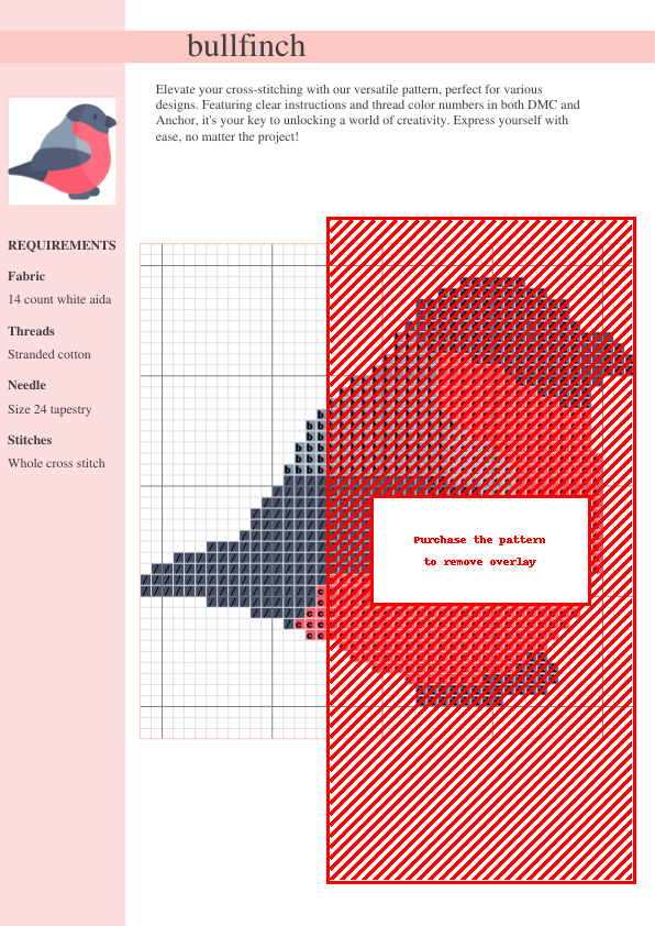 Stitch a charming Bullfinch! This easy-to-follow cross stitch pattern uses DMC and Anchor threads, creating a beautiful nature-inspired design perfect for all skill levels. Instant PDF download! Includes a complete color key with both DMC and Anchor thread numbers and easy-to-follow instructions. Perfect for beginners and experienced stitchers alike. Create a stunning piece of handmade art!