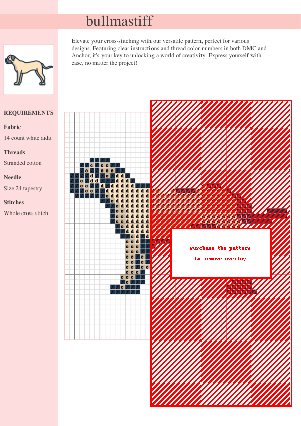Capture the noble spirit of a Bullmastiff with this exquisite cross-stitch pattern! This downloadable PDF pattern provides clear, easy-to-follow instructions and color charts using both DMC and Anchor thread numbers, ensuring a smooth stitching experience for crafters of all skill levels. The design beautifully showcases the breed’s distinctive features – gentle eyes, powerful physique, and loyal expression – making it a perfect project for dog lovers and cross-stitch enthusiasts alike. The detailed chart spans two pages, presenting a comprehensive design with symbols and a complete list of required DMC and Anchor thread codes. This pattern is perfect for intermediate to advanced stitchers seeking a challenging and rewarding project. Imagine the finished piece as a heartwarming wall hanging for your home, a unique and personalized pillow cover, or a truly memorable gift for a fellow dog lover – the creative possibilities are endless! Download your pattern instantly after purchase and embark on this rewarding crafting adventure. Bring the majestic presence of a Bullmastiff into your life, one stitch at a time. This pattern includes both DMC and Anchor thread equivalents.