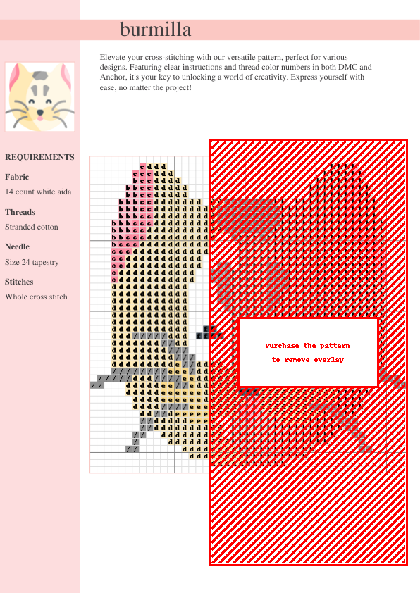 Stitch up a purrfectly adorable Burmilla cat with this delightful cross-stitch pattern! This easy-to-follow design is ideal for cross-stitchers of all skill levels, from beginners to experienced crafters. The pattern showcases a beautifully rendered Burmilla cat, capturing its luxurious coat and expressive eyes in a charming pastel color palette. Clear and concise instructions are included, along with a comprehensive thread color chart using both DMC and Anchor thread numbers for your convenience. The downloadable PDF pattern (spanning two pages) provides a detailed chart and a handy thread list. Create a stunning piece for yourself, a unique gift for a cat lover, or add a touch of feline flair to your home décor. Ideal for framing, adding to a sampler, or incorporating into a larger needlepoint project. The finished piece measures 6×6 inches, making it a manageable yet rewarding project. Unleash your creativity and stitch your way to a charming, purrfect masterpiece! This relaxing project also offers the therapeutic benefits of stitching. Download your pattern today and start stitching!