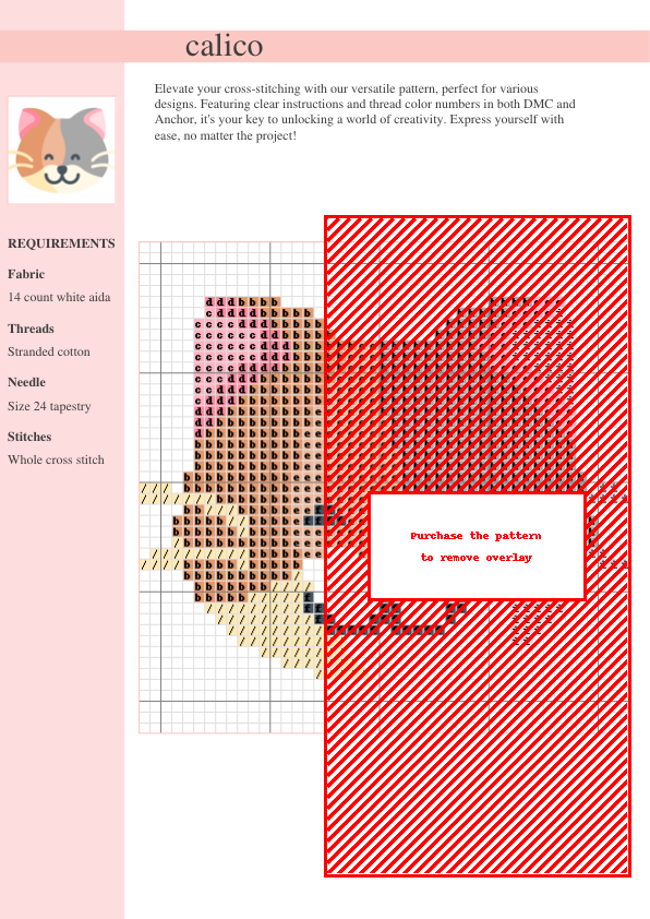 Stitch up some purrfect charm with our adorable Calico Cat Cross Stitch Pattern! This delightful design features a playful calico cat, bursting with personality, perfect for adding a touch of whimsical elegance to your home décor, or creating a unique handmade gift. The pattern boasts intricate details in the cat’s fur, expressive eyes, and playful pose, making it a rewarding project for cross-stitch enthusiasts of all skill levels. Clear, easy-to-follow instructions and a comprehensive thread color key using both DMC and Anchor thread numbers ensure a smooth stitching experience. Download your instant PDF pattern after purchase and begin creating your charming masterpiece! This two-page PDF includes a full-color pattern chart with symbols and a complete DMC and Anchor thread list, making it easy to select your preferred brand. Perfect for pillows, wall art, samplers, or a unique gift for a cat lover! The pattern is designed to be accessible for beginner to intermediate stitchers, making it a fun and fulfilling project for crafters of all skill levels. Let your needle do the talking with this captivating design! Embrace the joy of crafting and create a beautiful piece of art with this easy-to-follow, high-quality pattern.