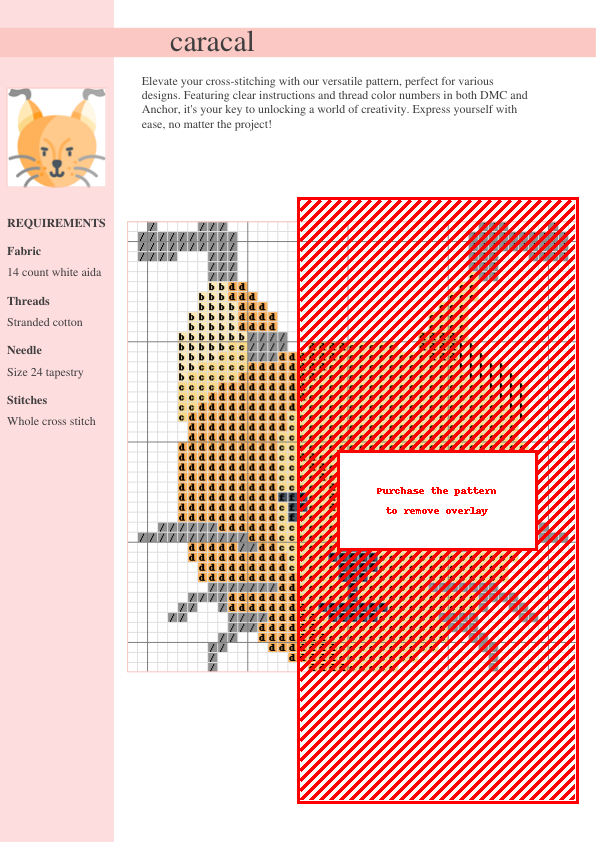 Embark on a thrilling cross-stitch journey with our exquisite Caracal pattern! This intricate design captures the majestic beauty of this elusive desert cat, offering an engaging challenge for experienced stitchers. The pattern provides clear, easy-to-follow instructions and a comprehensive color key utilizing both DMC and Anchor stranded cotton thread numbers, ensuring a smooth stitching experience. Imagine the rich, earthy tones of the desert brought to life in vibrant detail through your needlework! This two-page PDF pattern is available for instant download, allowing you to begin your project immediately. The pattern includes a symbol key and a complete pattern chart for a seamless crafting process. Perfect for creating unique wall art, decorative pillows, or adding a touch of wild elegance to your home decor. Unleash your creativity and stitch a breathtaking masterpiece! This intermediate to advanced level pattern is sure to satisfy your creative desires and make a stunning addition to your cross-stitch collection. Finished piece will showcase the Caracal’s stunning details, from its striking fur patterns to its piercing gaze, creating a captivating piece of textile art. This rewarding project is perfect for those who love a challenge and wish to showcase their skills. Download your pattern and start stitching today!