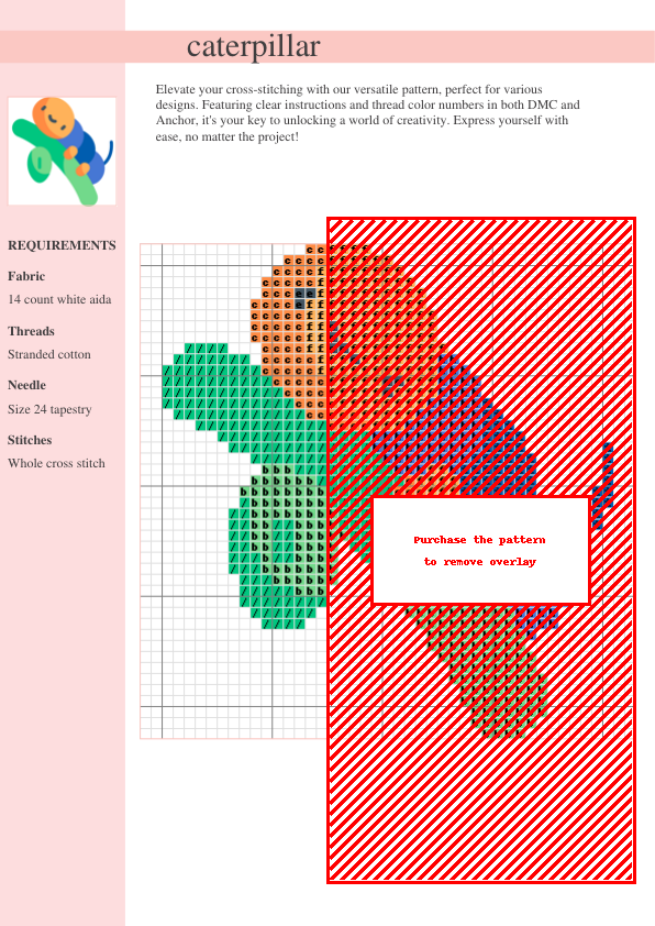 Embark on a charming cross-stitch adventure with our delightful Caterpillar pattern! This versatile design is perfect for adding a touch of whimsy to your creations, from wall art and greeting cards to clothing and accessories. The pattern showcases a cute and colorful caterpillar crawling amongst vibrant leaves and flowers, making it an ideal project for both beginner and experienced stitchers. Clear, easy-to-follow instructions are included, along with corresponding DMC and Anchor thread color numbers for effortless stitching. The pattern is presented in a user-friendly two-page PDF, ensuring a smooth and enjoyable cross-stitching experience. This instant download provides a detailed pattern chart with symbols and a complete list of required DMC and Anchor thread codes. The design incorporates a playful color palette, perfect for adding a touch of spring or summer to your projects. Let your creativity bloom with this enchanting design โ perfect for gifting or personal enjoyment! Enhance your cross-stitch skills with techniques like backstitching (where applicable). This design is a wonderful addition to your nature-themed cross stitch projects and makes a great beginner cross stitch pattern. Download your pattern today and start stitching!
