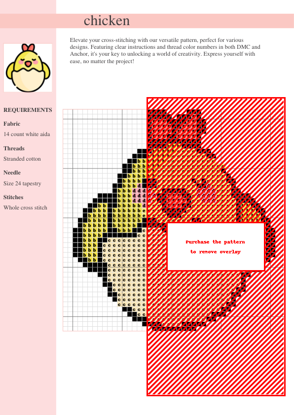 Adorable chicken cross-stitch pattern! Easy-to-follow instructions and color charts for both DMC and Anchor threads make this instantly downloadable PDF perfect for all skill levels. Create charming home decor, unique gifts, or fun projects for yourself. Download and stitch today!