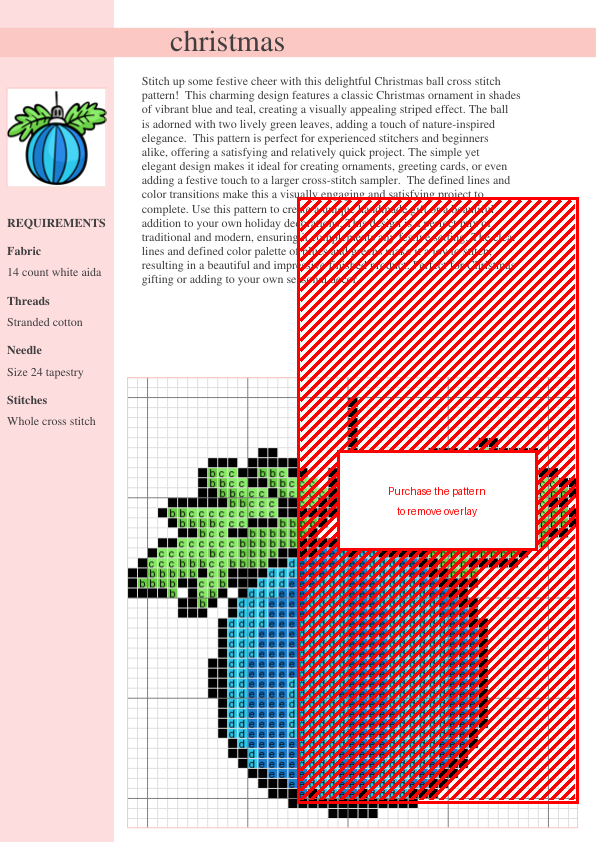 Stitch up some holiday cheer with this charming Christmas ball cross stitch pattern! This delightful design features a classic Christmas ornament in vibrant teal and blue stripes, accented by two cheerful green leaves. The simple yet elegant design is perfect for creating unique handmade Christmas ornaments, adding a festive touch to greeting cards, or incorporating into a larger cross-stitch sampler. Perfect for stitchers of all skill levels, this pattern offers a satisfying and relatively quick project. The clear lines and defined color transitions make for a visually engaging stitching experience, resulting in a beautiful and impressive finished piece. Use this pattern to create a handmade gift or a stunning addition to your holiday décor. This design expertly blends traditional and modern styles, ensuring it complements any festive setting. The carefully chosen color palette of teal, blue, and green offers a joyful stitching experience. Download your pattern instantly after purchase and add a touch of handmade holiday cheer to your celebrations! This is a digital download; no physical product will be shipped. This cross stitch pattern is perfect for Christmas crafting, holiday decorations, and gift-giving.