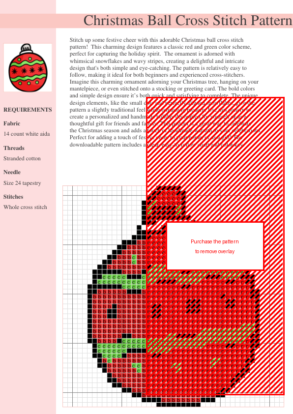 Stitch up some holiday cheer with this delightful Christmas ball cross stitch pattern! This charming design features a classic red and green color palette, perfectly embodying the festive spirit. Adorned with whimsical snowflakes and elegant wavy stripes, the ornament boasts an intricate yet easy-to-follow design, perfect for cross-stitchers of all skill levels. The pattern’s bold colors and precise details, like the small dots and perfectly aligned snowflakes, add a touch of elegance and a handmade touch to your holiday décor. Imagine this beautiful ornament adorning your Christmas tree, adding a personal touch to your celebrations. It makes a heartwarming personalized decoration or a thoughtful, unique gift for friends and family. This quick and satisfying project is perfect for beginners and experienced crafters alike, offering a blend of traditional charm and modern simplicity. The downloadable PDF pattern includes clear, easy-to-read charts and a comprehensive color key, ensuring a smooth stitching experience. Download your pattern today and celebrate the Christmas season with handmade warmth! This cross stitch pattern is ideal for holiday crafting, Christmas decorations, and gifting. Skill level: Easy to intermediate.