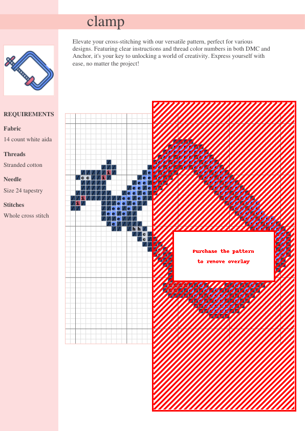 Unleash your inner artist with the ‘Clamp’ cross stitch pattern! This captivating modern geometric design features a striking interplay of sharp lines and negative space, creating a sophisticated industrial chic aesthetic. Perfect for adding a touch of contemporary flair to your home décor, this pattern is equally suitable for crafting unique gifts. The easy-to-follow instructions include a clear symbol chart, detailed stitch guide, and comprehensive thread color codes for both DMC and Anchor threads, making it accessible to cross-stitchers of all skill levels, from beginners to seasoned pros. This two-page PDF pattern is an instant download, allowing you to start stitching immediately after purchase. Imagine the possibilities: a stunning pillow, eye-catching wall art, or even a one-of-a-kind accessory! The ‘Clamp’ pattern offers a rewarding stitching experience and a beautiful, modern piece to proudly display. Experience the satisfaction of creating something truly unique with our meticulously designed pattern. Let your creativity shine!