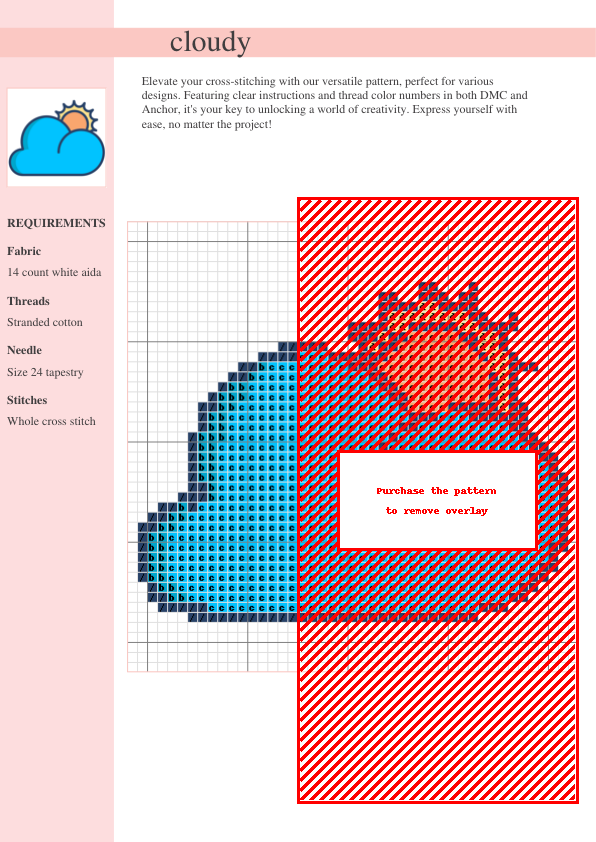 Stitch a peaceful scene with our ‘Cloudy Skies’ cross stitch pattern! This downloadable PDF pattern includes a clear color chart, DMC & Anchor thread lists, easy instructions, and is perfect for beginners and experienced stitchers. Create a beautiful cloud design for your home or as a unique gift. Instant download! Perfect for needlepoint and cross-stitch.