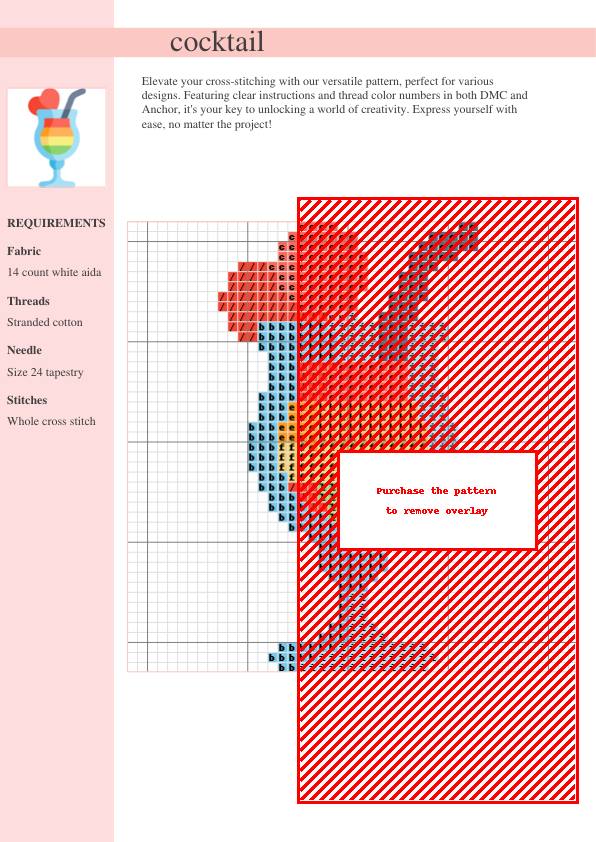 Stitch a stylish and refreshing cocktail scene with our ‘Mixology Magic’ cross stitch pattern! This downloadable PDF includes easy-to-follow instructions, DMC & Anchor thread color codes, and a full-color chart. Perfect for home décor, a unique gift, or a relaxing crafting project for intermediate stitchers. Enjoy the vibrant colors and detailed design!