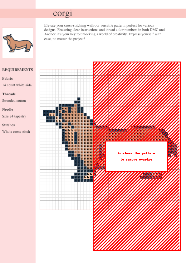 Stitch up some paw-some charm with this delightful Corgi cross-stitch pattern! Perfect for beginner to intermediate stitchers, this charming design features a sweet and detailed corgi. The clear, easy-to-follow instructions and color charts utilize both DMC and Anchor thread numbers for convenient material gathering. Imagine your finished creation β a cute wall hanging, a charming pillow cover, or a unique personalized gift! This two-page PDF pattern includes a symbol chart and a comprehensive list of DMC and Anchor thread color codes, ensuring a smooth stitching experience. Download your PDF instantly after purchase and let your creativity shine! This pattern is a perfect blend of simplicity and intricate detail, making it a rewarding project for crafters of all levels. The adorable design is sure to bring a smile to any face, and makes a wonderful gift for dog lovers and cross-stitch enthusiasts. Start stitching your adorable Corgi today! Includes a color chart, symbol chart, and thread list for both DMC and Anchor threads. This pattern is great for cross stitch beginners and intermediate crafters looking for a fun and rewarding project.