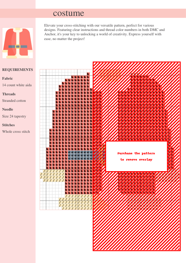 Unleash your creativity with our enchanting Costume Cross Stitch Pattern! This downloadable two-page PDF pattern offers a versatile design perfect for adding a touch of whimsy to clothing, accessories, framed art, or even Halloween projects. The pattern boasts clear, easy-to-follow instructions and conveniently includes both DMC and Anchor thread color codes for stress-free stitching. A detailed symbol chart ensures a precise and satisfying stitching experience, regardless of your skill level – perfect for both seasoned cross-stitchers and beginners seeking a fun challenge. Imagine the possibilities: a charmingly embroidered tote bag, a unique Halloween costume accessory, a captivating piece of framed art, or personalized gifts. The complete thread list simplifies supply gathering, allowing you to quickly begin your costume-themed masterpiece. This pattern is ideal for costume design, theatrical projects, handmade gifts, or simply adding a unique touch to your personal style. Let your imagination soar and personalize your creations with this delightful design! Download your pattern today and embark on a fun cross-stitch adventure!