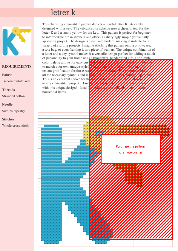 Unlock happiness with this charming cross-stitch pattern! This delightful design features a playful letter K shaped like a whimsical key, bursting with cheerful teal and sunny yellow hues. Perfect for beginner to intermediate stitchers, it offers a satisfying blend of simplicity and intricate detail. The clean lines and unique key-letter design make it incredibly versatile. Stitch it onto a pillowcase, tote bag, or frame it as wall art – the possibilities are endless! The simple color scheme allows for easy customization, letting you personalize the pattern with your favorite threads. This digital download includes a full-color chart, symbol key, and easy-to-follow instructions for a smooth crafting experience. Add a touch of personalized charm to your home or create a thoughtful, handcrafted gift. Embark on a fun stitching journey – download now and let your creativity flow! This pattern is a great way to add a personalized touch to gifts or home decor, suitable for all skill levels from beginner to intermediate crafters.