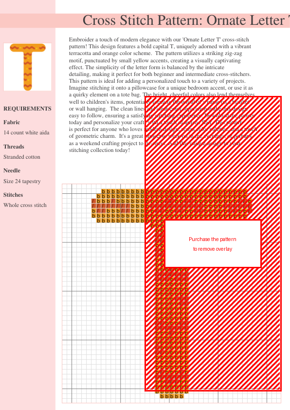 Elevate your crafting with our ‘Ornate Letter T’ cross-stitch pattern! This vibrant design showcases a bold capital T, exquisitely embellished with a striking terracotta and orange zig-zag motif. Cheerful yellow accents add a playful contrast, creating a captivating visual effect. The clean lines of the letter are balanced by intricate detailing, making it perfect for both beginner and intermediate cross-stitchers. Its versatility shines – imagine this stunning letter adorning a cozy pillowcase, a stylish tote bag, a whimsical children’s blanket, or a breathtaking wall hanging. The bright, cheerful color palette and easy-to-follow instructions guarantee a satisfying stitching experience. Download your pattern instantly and infuse your crafts with artistic flair. This modern design is perfect for enthusiasts of warm color palettes and geometric charm. Enjoy a relaxing and creative project, ideal for self-expression and crafting satisfaction. Perfect for gifts or home decor projects.