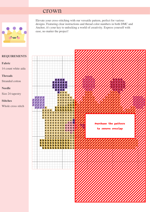 Stitch a stunning crown! This easy-to-follow cross-stitch pattern includes DMC and Anchor thread charts for convenient color selection. Instant digital download. Perfect for intermediate/advanced stitchers. Create regal wall art, unique pillows, or exquisite samplers. Add a touch of royal elegance to your next project!