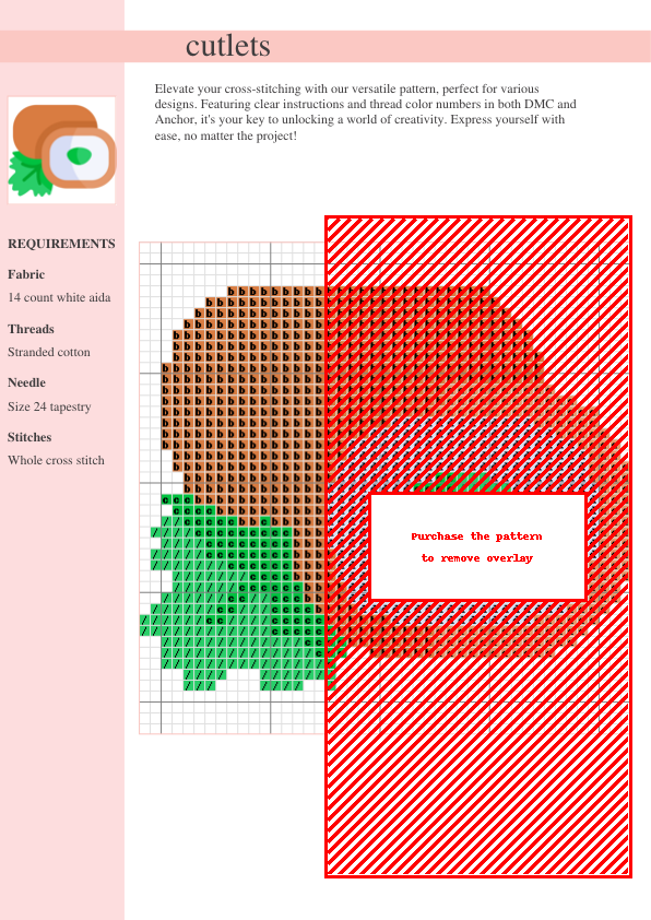 Stitch up some deliciousness with the ‘Cutlets’ Cross Stitch Pattern! This easy-to-follow PDF pattern features a detailed color chart, DMC & Anchor thread color codes, and is perfect for adding a fun, culinary touch to your home or gifting. Instant download! Intermediate skill level.