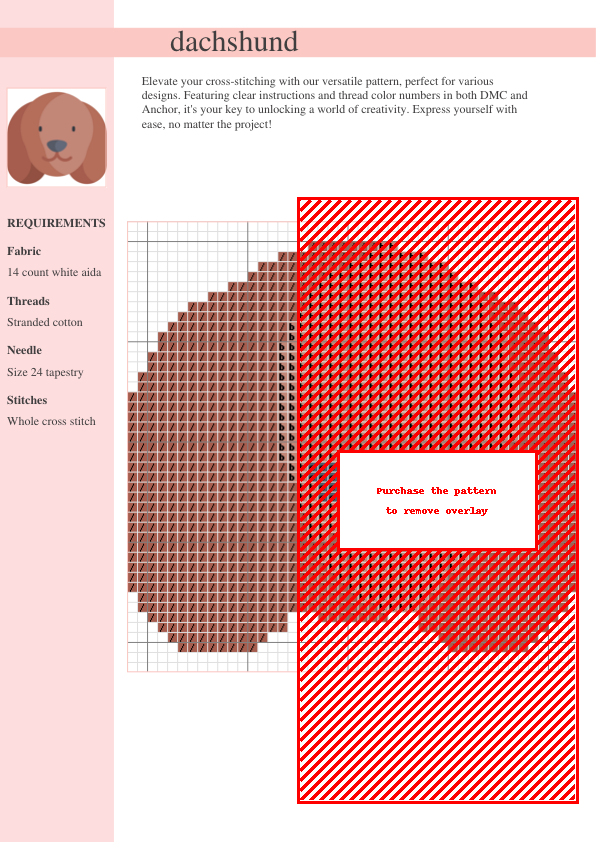 Stitch up some adorable charm with our delightful Dachshund Cross Stitch Pattern! This easy-to-follow PDF pattern features a charming wiener dog, perfect for adding a touch of canine cuteness to your home decor, gifts, or personal projects. The pattern includes clear, color-coded symbols and a comprehensive thread list using both DMC and Anchor thread numbers, ensuring a smooth stitching experience for cross-stitch enthusiasts of all skill levels. This digital download provides immediate access to detailed instructions and the pattern chart, allowing you to start stitching your precious pup right away! The versatile design can be stitched on various fabrics and in different sizes to perfectly match your vision. Experiment with different color palettes to personalize your Dachshund and unleash your creativity! Add a touch of playful elegance to your stitching journey. Perfect for beginners and experienced stitchers alike. Download now and start stitching your own adorable Dachshund!
