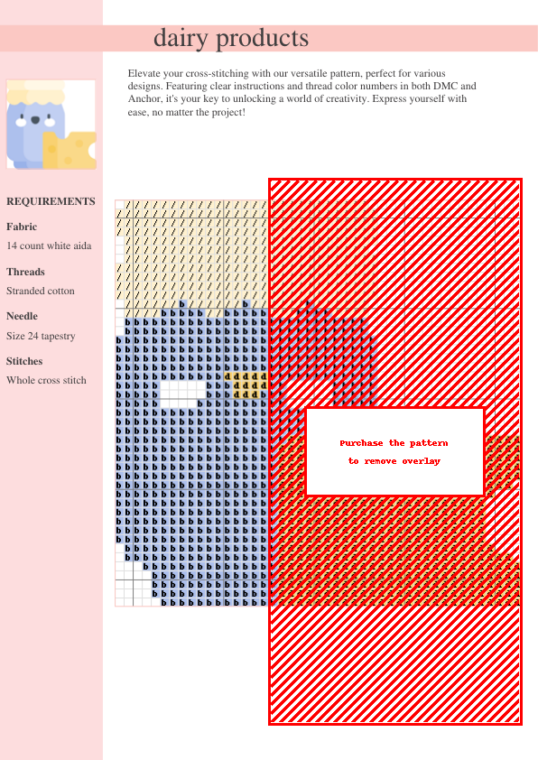 Stitch a charming dairy-themed cross-stitch with our easy-to-follow ‘Dairy Delight’ pattern! Includes DMC & Anchor thread color codes, an instant PDF download, and is perfect for beginners and experienced stitchers. Create a heartwarming, rustic-style piece for your home or as a unique gift. Download your pattern and start stitching today!