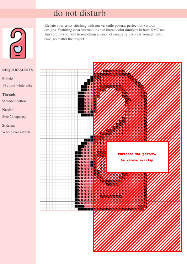 Downloadable PDF cross stitch pattern featuring a modern ‘Do Not Disturb’ design. Includes clear symbols, DMC & Anchor thread color keys, perfect for creating unique home décor or personalized gifts. Easy for beginners, satisfying for experts! Instant download.