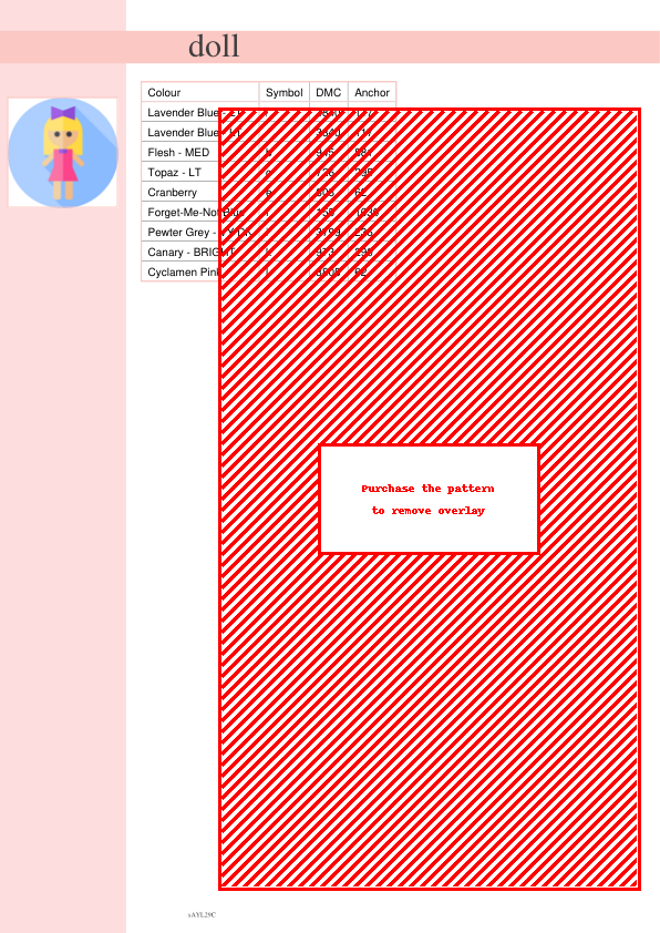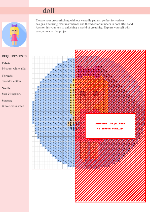 Stitch up an adorable handmade doll with this delightful cross-stitch pattern! Perfect for crafters of all skill levels, from beginners to experienced stitchers, this charming design offers a rewarding and enjoyable crafting experience. The pattern includes clear, easy-to-follow instructions and a comprehensive color chart featuring both DMC and Anchor thread numbers, ensuring a smooth stitching process. This convenient two-page PDF download allows you to start your project instantly after purchase. Unwind and express your creativity while crafting this sweet doll, ideal for home decor, gifts, ornaments, or adding a personal touch to any project. The intricate details and charming design make it a truly special creation. Download your pattern now and begin creating your own precious doll! This pattern is perfect for adding a touch of handmade charm to your life. Experience the joy of cross-stitching with this delightful and accessible project.