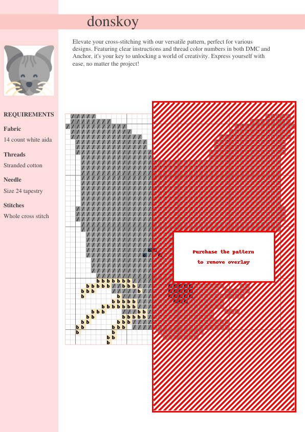 Stitch up this charming Donskoy cat cross stitch pattern and add a touch of whimsical charm to your home! This delightful design features a playful Donskoy kitten, its unique hairless texture beautifully captured in intricate detail. The pattern includes a detailed color chart with symbols and color codes for both DMC and Anchor threads, ensuring a smooth and enjoyable stitching experience. Clear instructions make it suitable for both beginners and experienced cross-stitchers. Imagine this adorable feline adorning a pillow, wall hanging, or a unique greeting card. Download your PDF pattern instantly after purchase and unleash your creativity! This purrfect pattern is a rewarding project, offering a satisfying stitch count and a beautiful finished product. The comprehensive color key and easy-to-follow instructions ensure a stress-free stitching experience, from start to finish. Perfect for cat lovers and cross-stitch enthusiasts alike!