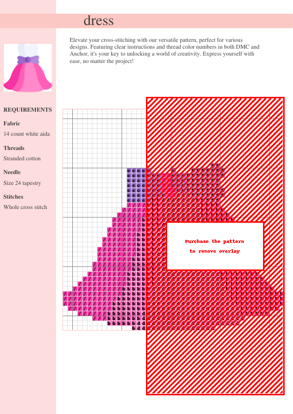 Downloadable cross-stitch pattern of an elegant dress. Includes detailed DMC and Anchor thread charts for easy stitching. Perfect for intermediate stitchers and beyond! Create beautiful wall art or personalized gifts. Easy-to-follow instructions.