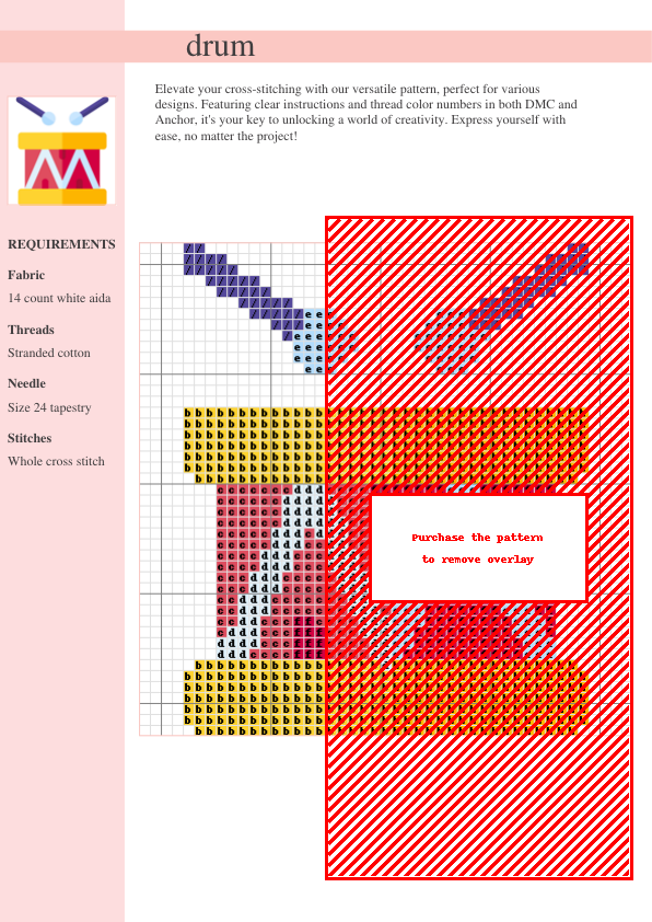 Create a vibrant and detailed drum cross-stitch with our easy-to-follow PDF pattern. Includes DMC and Anchor thread color charts for convenient stitching. Instant download – perfect for intermediate stitchers! Add a musical flair to your home or create a unique personalized gift. Enjoy this challenging yet rewarding cross-stitch project!