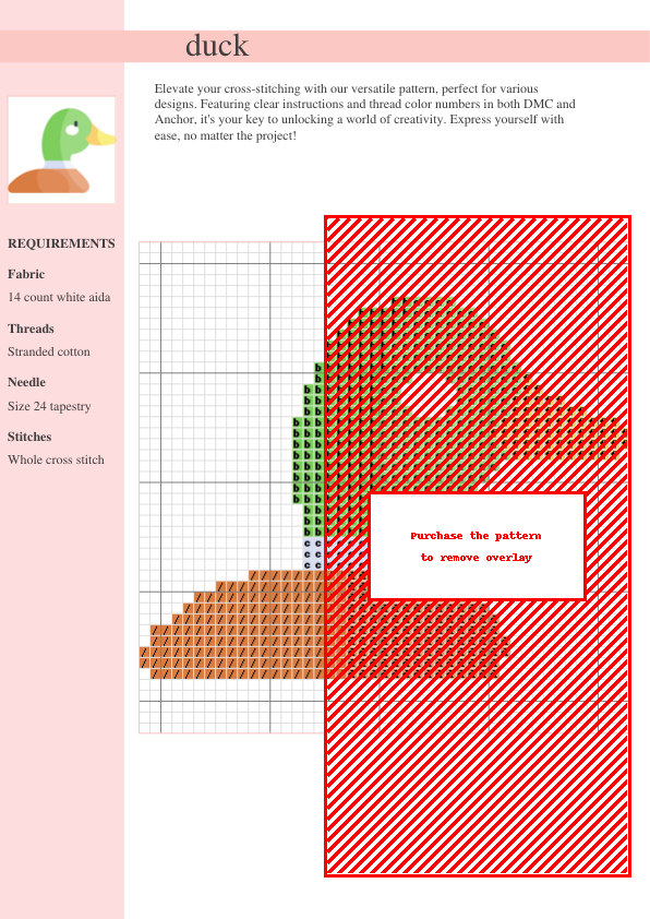 Stitch up some adorable charm with this delightful duck cross-stitch pattern! Perfect for cross-stitch enthusiasts of all skill levels, from beginners to experienced stitchers, this easy-to-follow design features a charming duck in a pleasing, customizable color palette. The clear instructions include both DMC and Anchor thread color codes for convenient shopping and effortless stitching. This digital download provides a two-page PDF containing a color-coded symbol chart, a complete thread list, and a detailed pattern for a smooth stitching experience. Instantly download and begin your crafting journey! This adorable duck cross-stitch is ideal for home decor, personalized gifts, or adding a touch of whimsy to your stitching samplers. Unleash your creativity and stitch this cute duck today! Download, stitch, and enjoy your new adorable friend! The pattern is designed to be accessible, making it a perfect project for beginners wanting to learn cross-stitch, while still offering enough detail to challenge more experienced crafters. The calming nature of the design and the simple yet effective result makes it a satisfying and relaxing crafting activity. Make it your own by choosing your favorite colors!