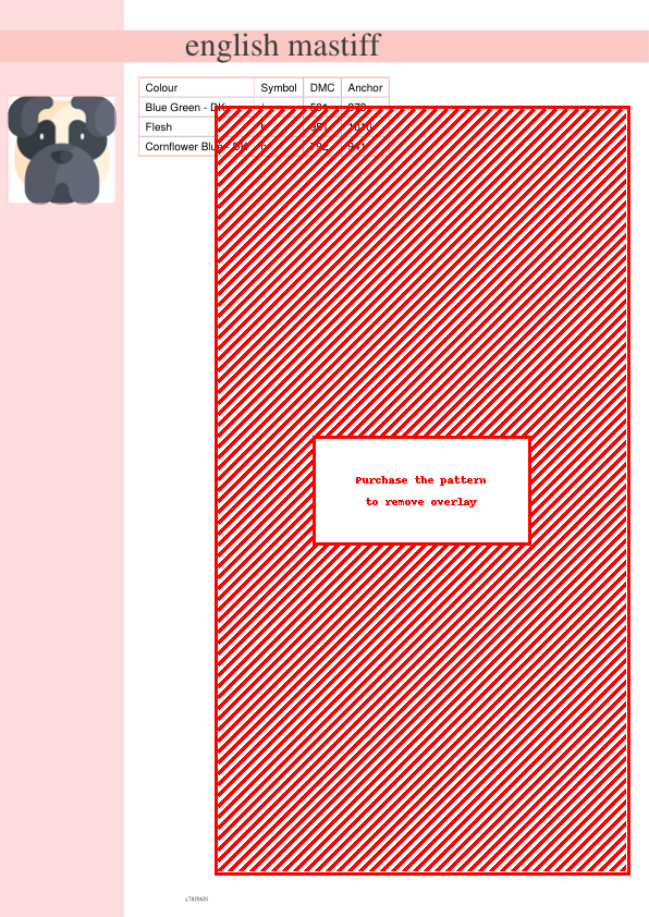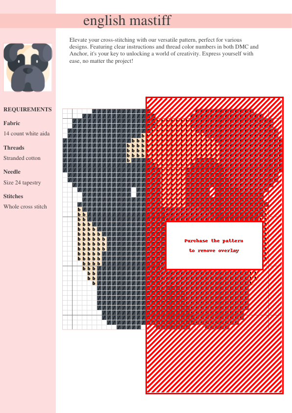 Capture the regal beauty of an English Mastiff with this exquisite cross-stitch pattern! This detailed design showcases the breed’s majestic features, offering an engaging and rewarding project for both experienced stitchers and those seeking a challenging new endeavor. The pattern provides clear, easy-to-follow instructions and a comprehensive color chart utilizing both DMC and Anchor thread numbers, ensuring a smooth stitching experience. The elegant design is perfectly suited for creating unique wall art, personalized gifts, or adding a touch of canine charm to home décor projects like pillows or cushions. Imagine the rich textures and deep colors of the Mastiff’s coat brought to life with your needlework! This two-page PDF pattern includes a symbol chart and complete thread list for both DMC and Anchor threads, allowing for flexibility in your thread choices. Download your pattern instantly after purchase and embark on this rewarding stitching adventure. Unleash your creativity and stitch a truly magnificent piece!