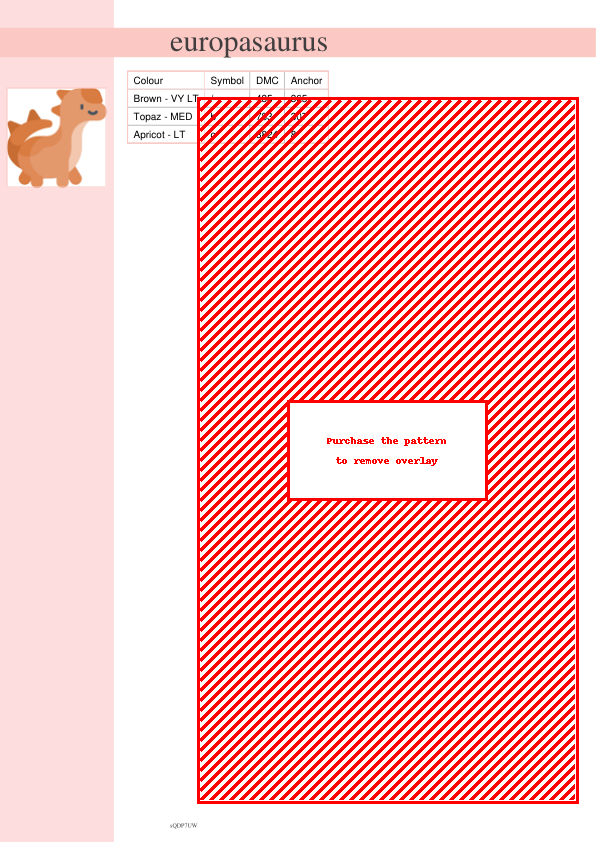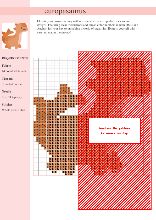 Stitch an adorable Europasaurus! This easy-to-follow cross stitch pattern features a detailed dinosaur design, DMC & Anchor thread charts, and a convenient downloadable PDF. Perfect for beginners and experienced stitchers, creating charming home décor, unique gifts, or fun personal projects.