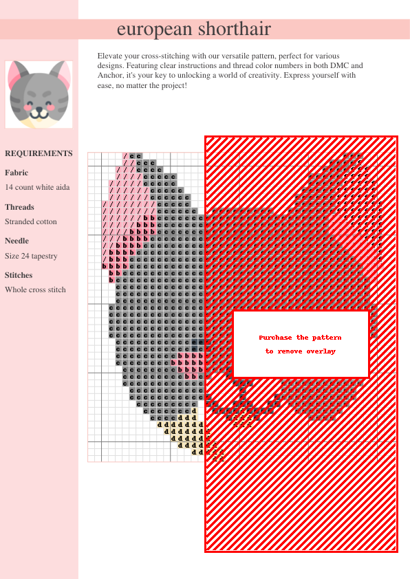 Stitch up some purrfect charm with this delightful cross-stitch pattern featuring an adorable European Shorthair cat! This design is a perfect project for both beginner and experienced cross-stitchers. The pattern boasts a clear and easy-to-follow chart utilizing symbols, with corresponding DMC and Anchor thread color codes provided for a seamless stitching experience. The detailed PDF download includes the pattern chart spread across two pages for convenient printing and comfortable stitching. The intricate details of the cat’s fur and expressive eyes, rendered in a charming style, make this a truly rewarding project. The soft and pleasing color palette, featuring [mention specific color range if possible, e.g., creams, greys, and blues], makes it perfect for adding a touch of feline charm to your home dΓ©cor. Imagine this endearing kitty adorning a cozy pillow, a charming wall hanging, counted cross stitch, a unique greeting card, or even a personalized gift β the possibilities are endless! Unleash your creativity and stitch up this meticulously crafted design. Download your PDF pattern instantly after purchase and start stitching today! This pattern is perfect for cat lovers, animal cross-stitch enthusiasts, and crafters of all skill levels. This pattern includes both DMC and Anchor thread color codes for your convenience. Finished size [add finished size if available].